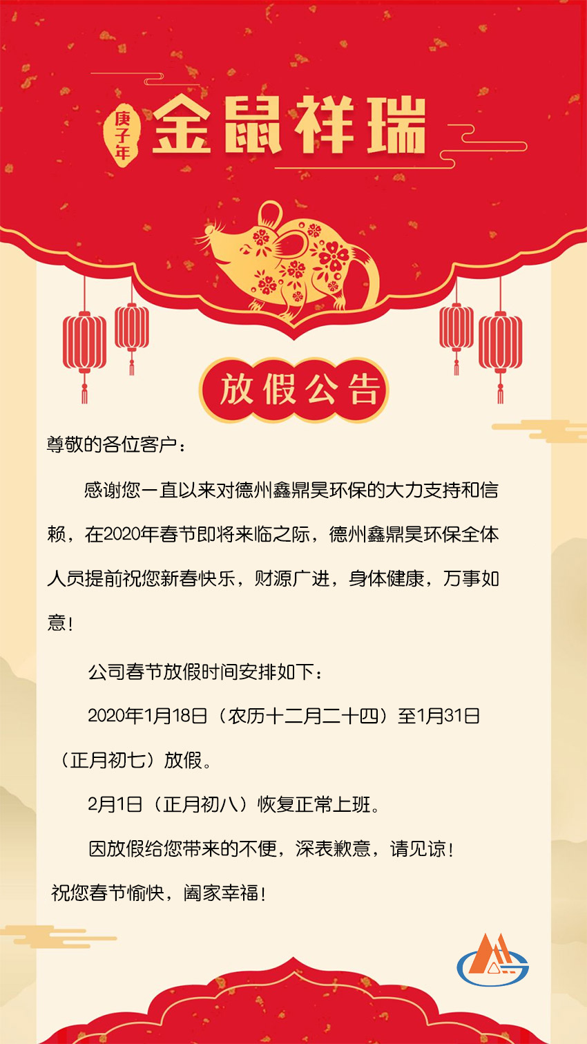 德州鑫鼎昊環保2020年春節放假通知