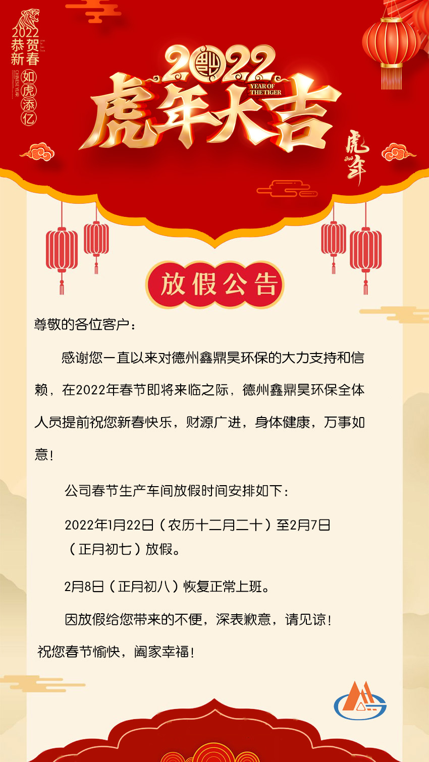 德州鑫鼎昊環保2022年春節放假通知
